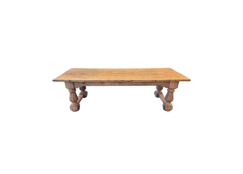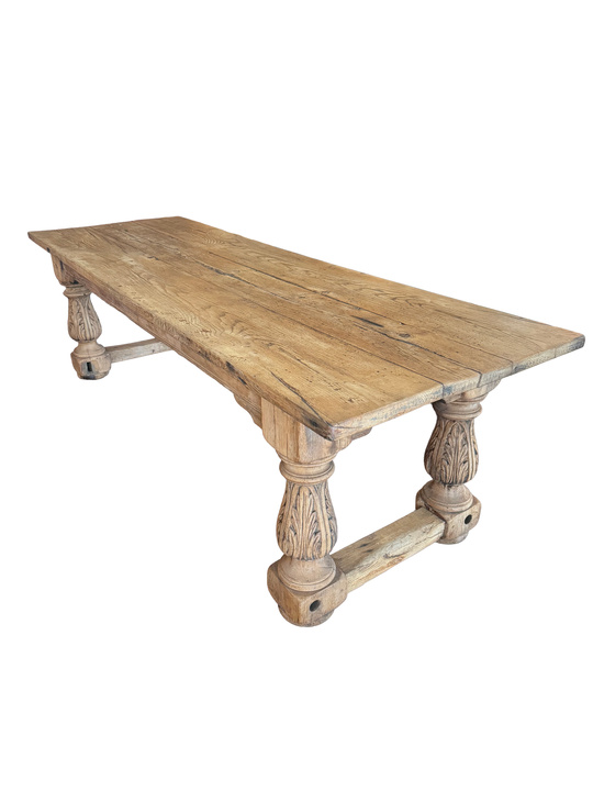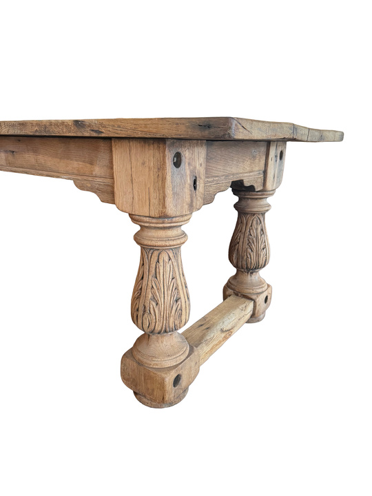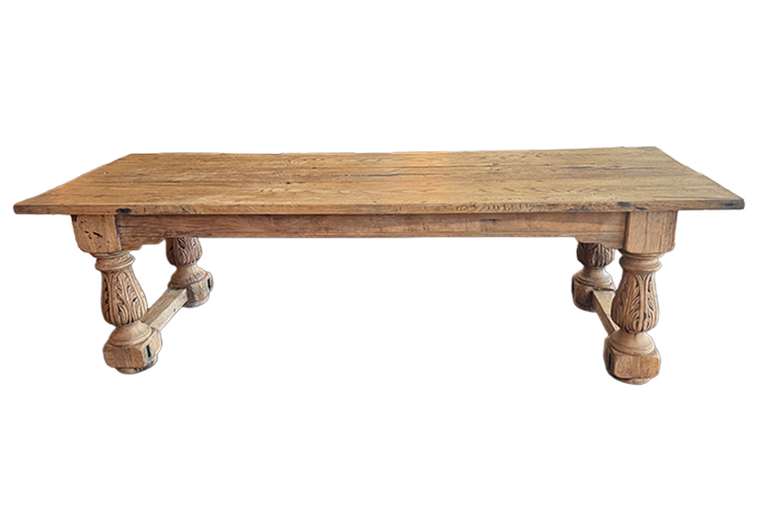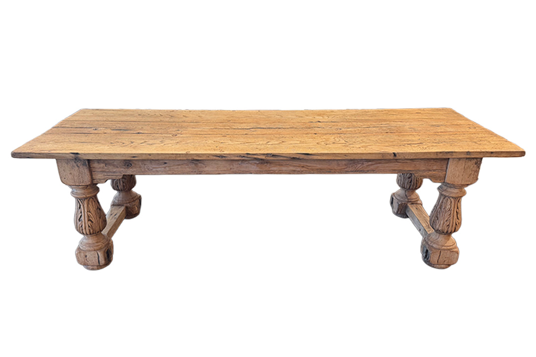 Early 19th century, France. Large table with ornately carved and turned legs with foliage motifs. A very robust piece with wide plank top. 24" from floor to bottom of apron.