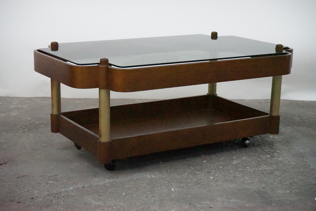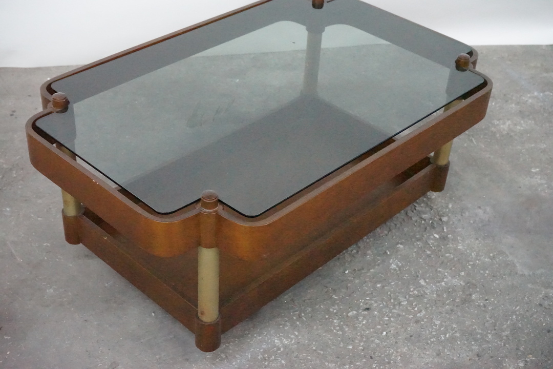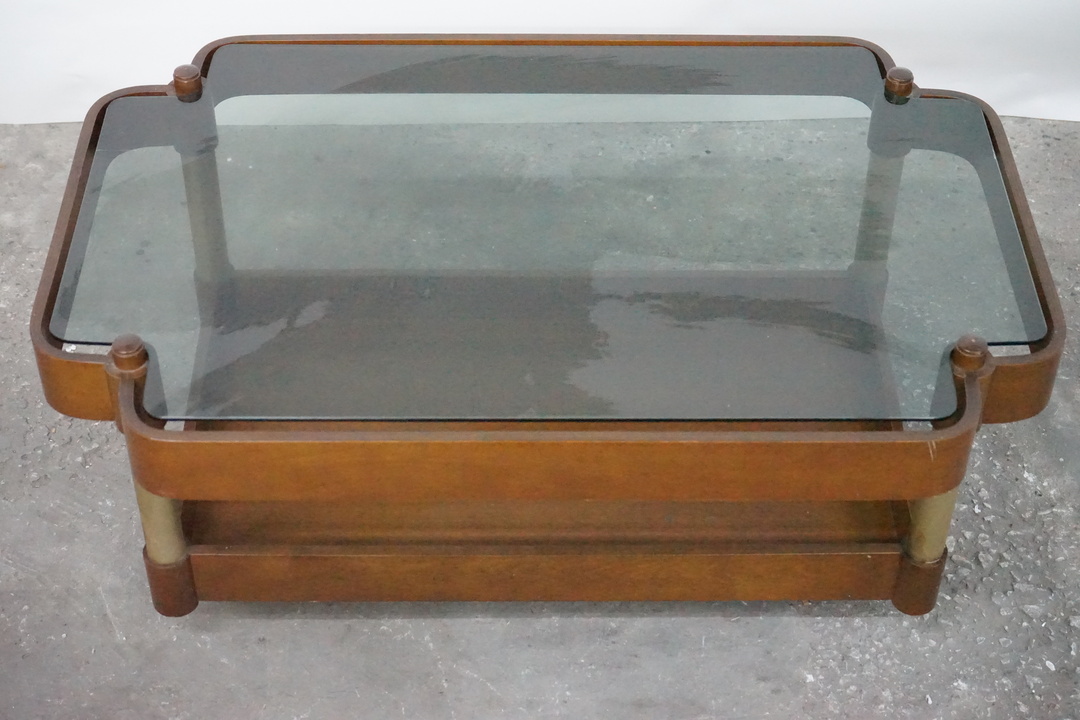 Mid-Century Coffee Table with Smoke Glass Top and Wood Lower Shelf