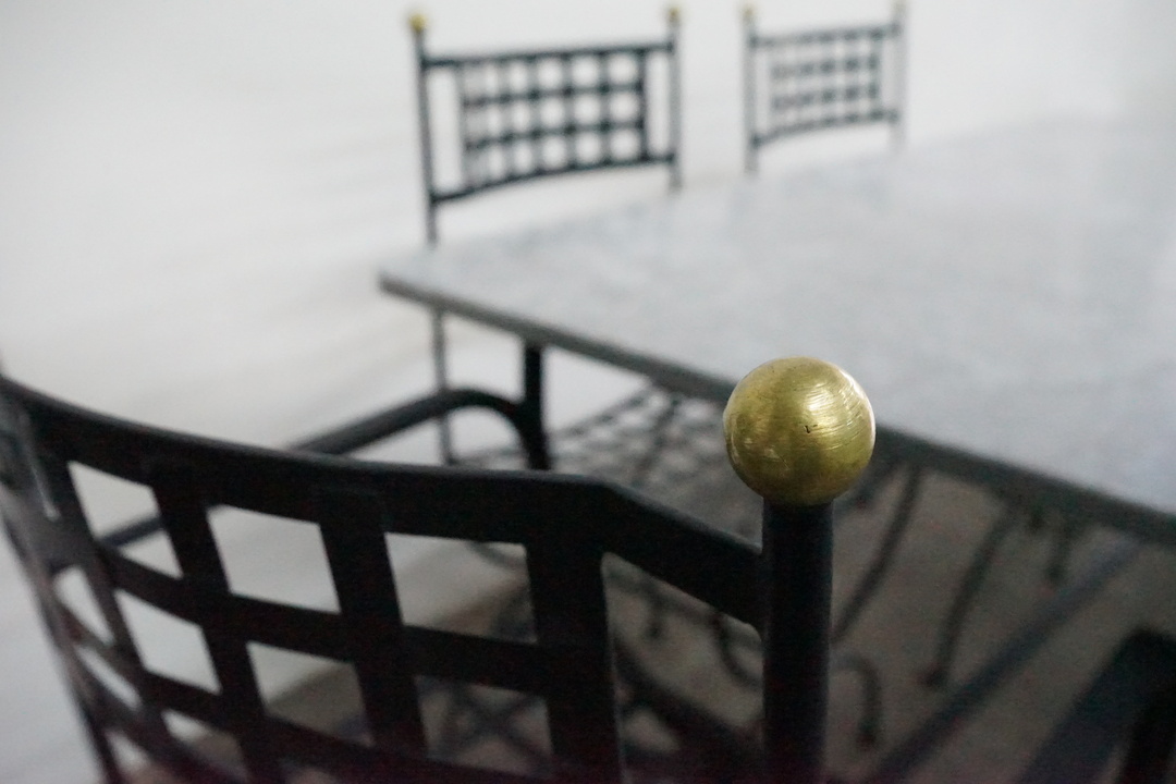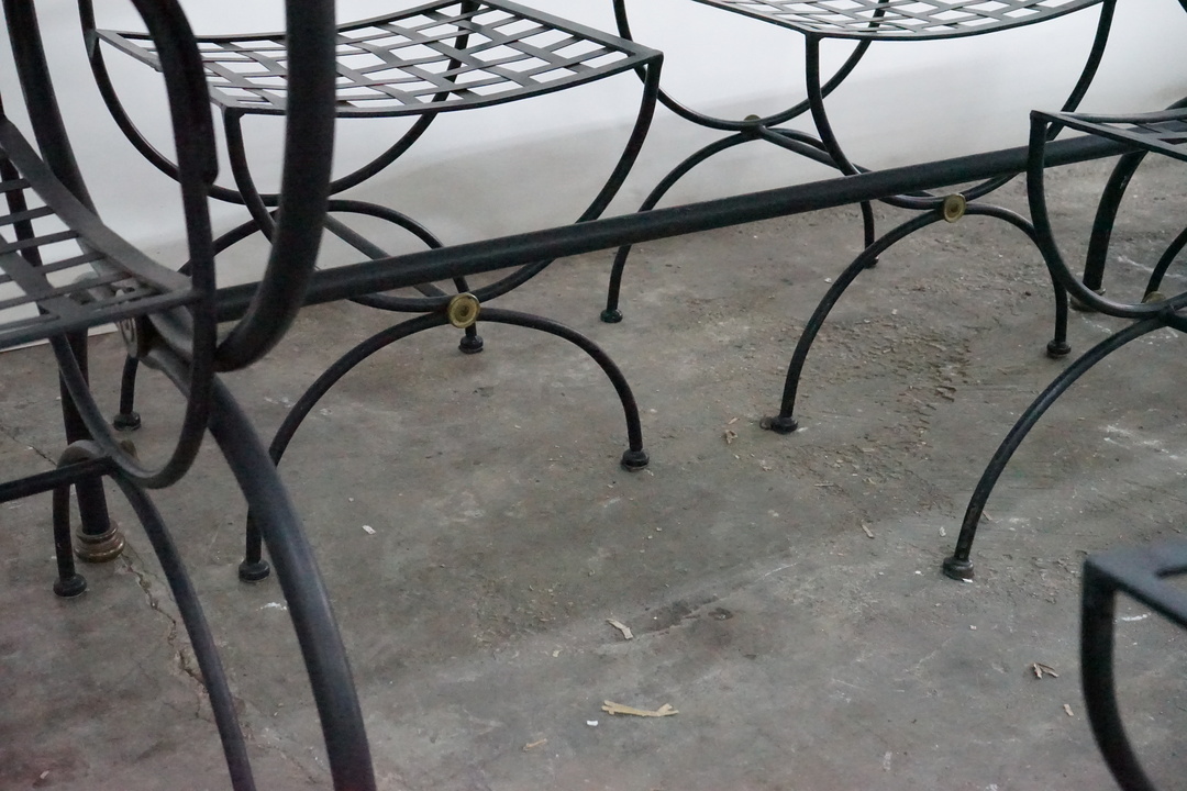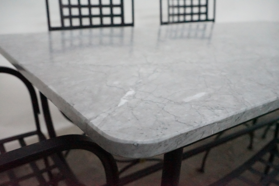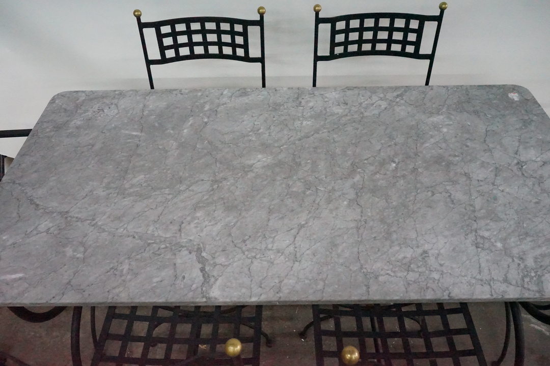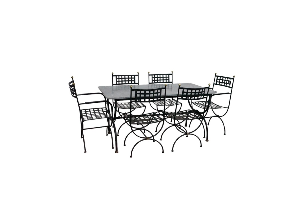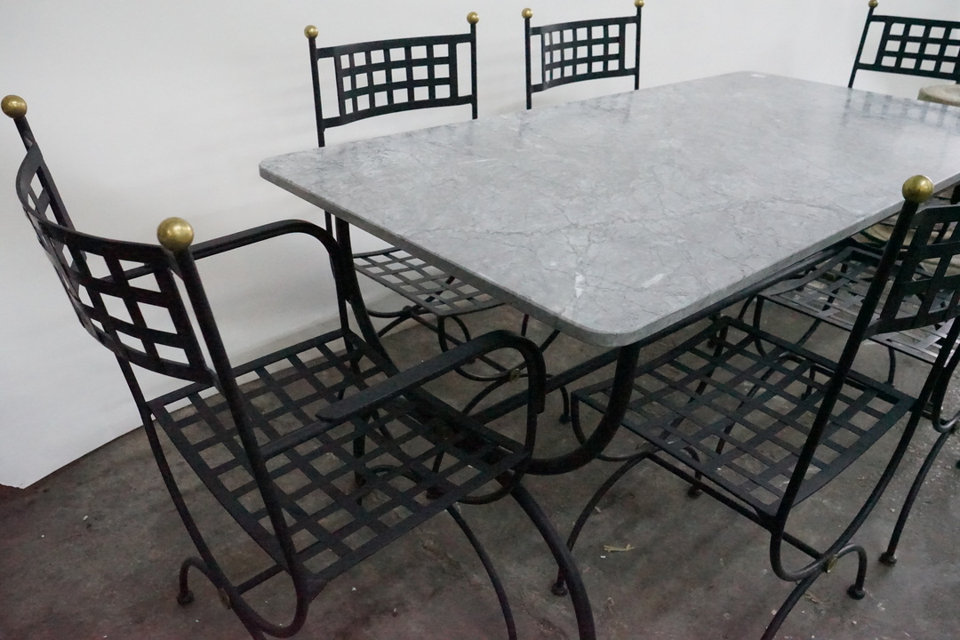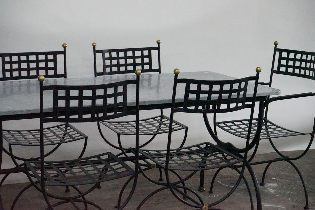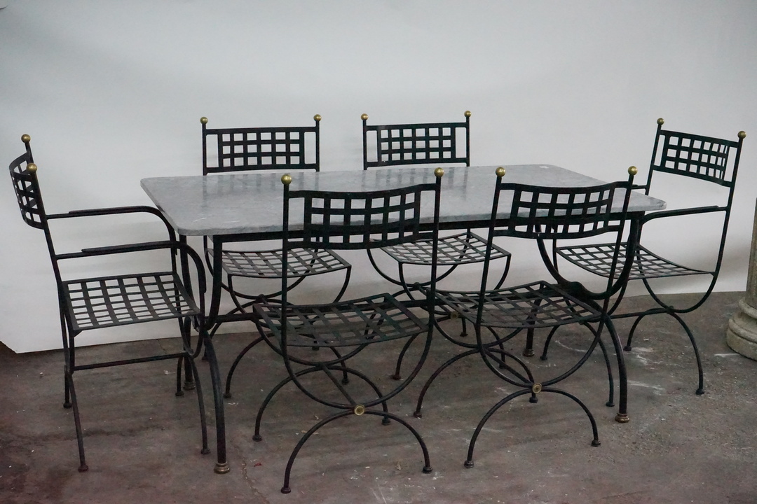 Priced and Sold as a Set: Includes (4) Iron Dining Chairs, (2) Iron Armchairs, and Marble Top Dining Table with Iron Base. Chair dimensions: 20.5" W x 17.5" D x 37.25" H Table dimensions: 63" W x 31.5" D x 29.75" H