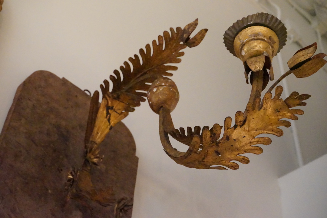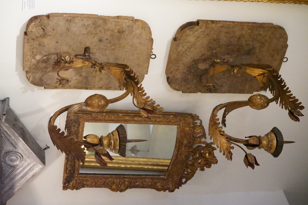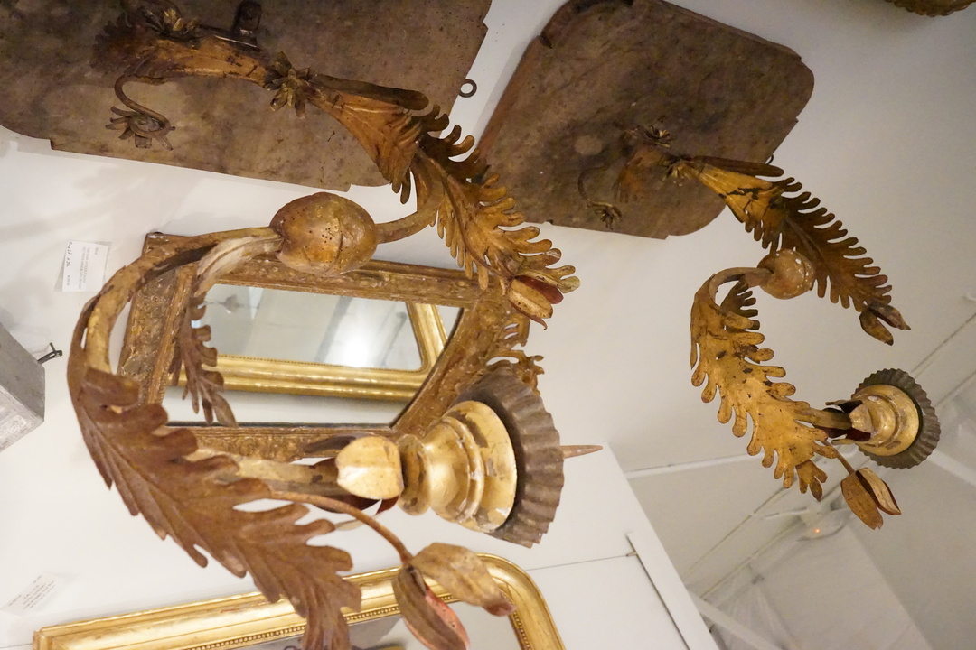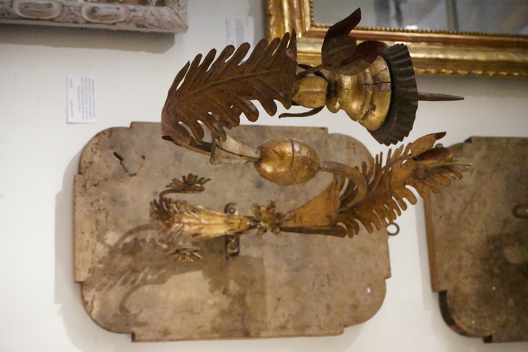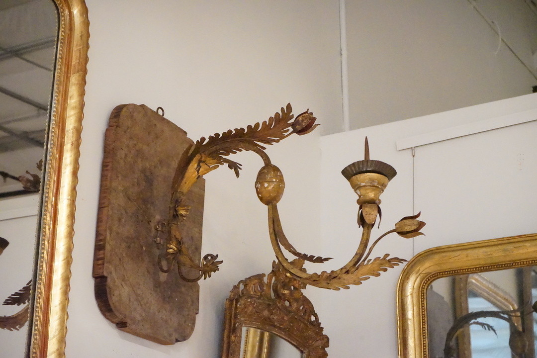 Very Rare 18th Century Italian Rococo Gilt and Hand Forged Iron Candle Sconces. Acanthus Leaf & Flower Motifs and Walnut Shield Back Plates