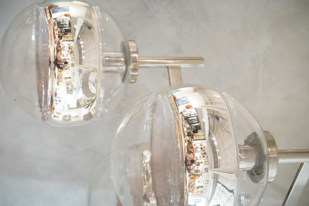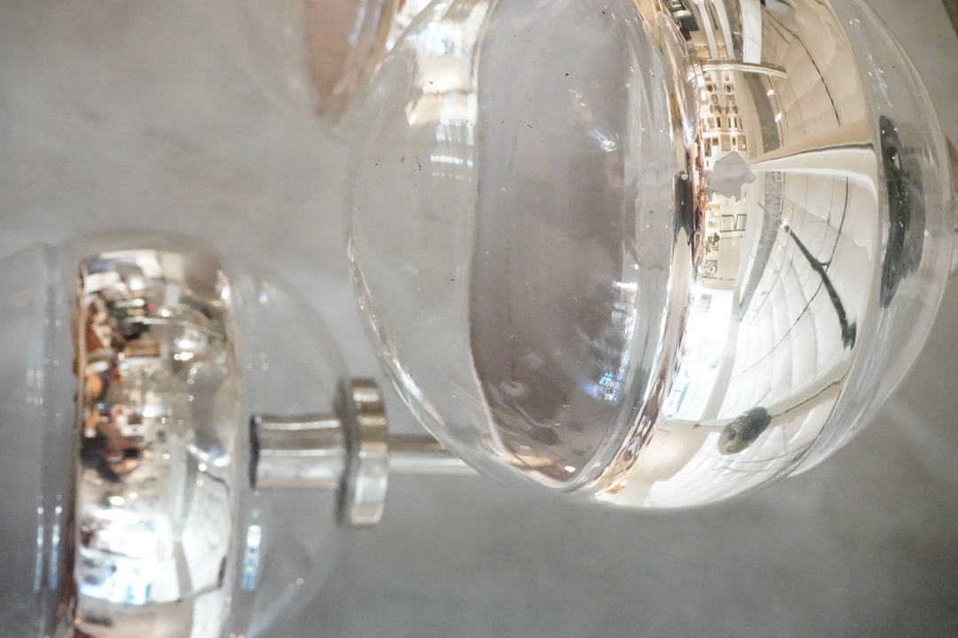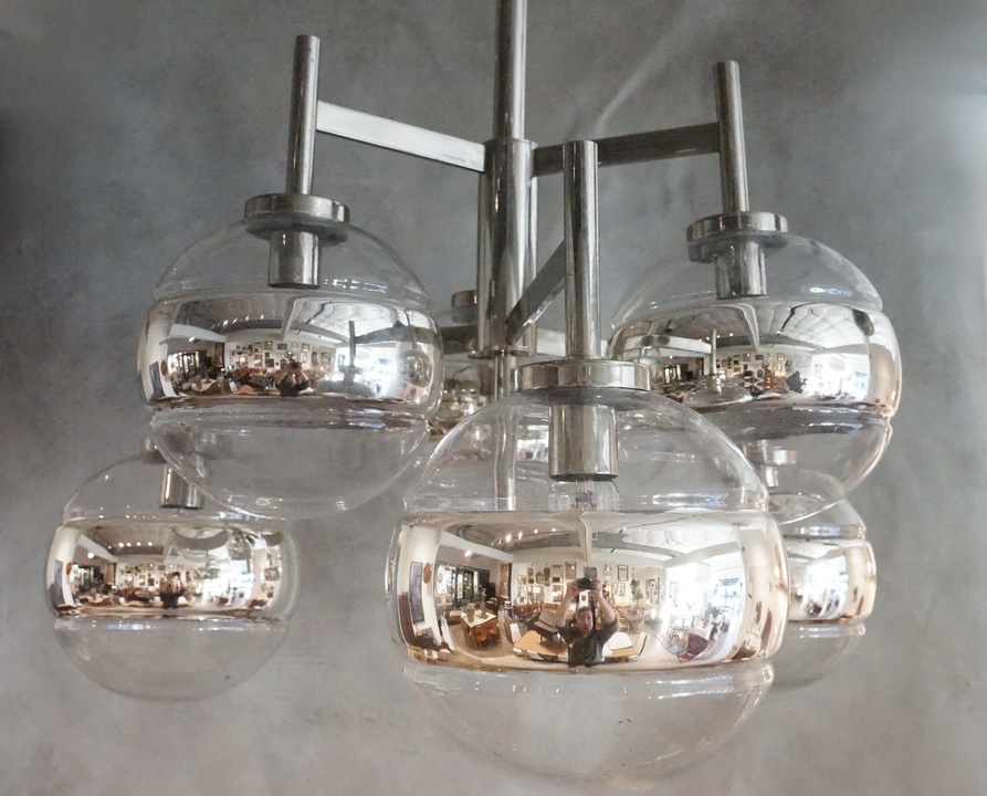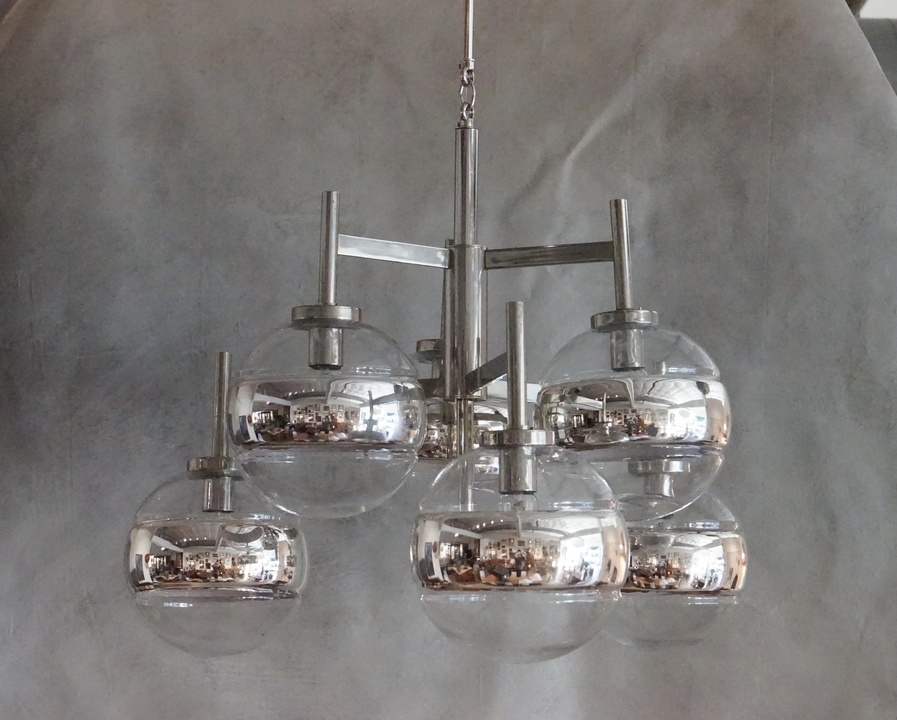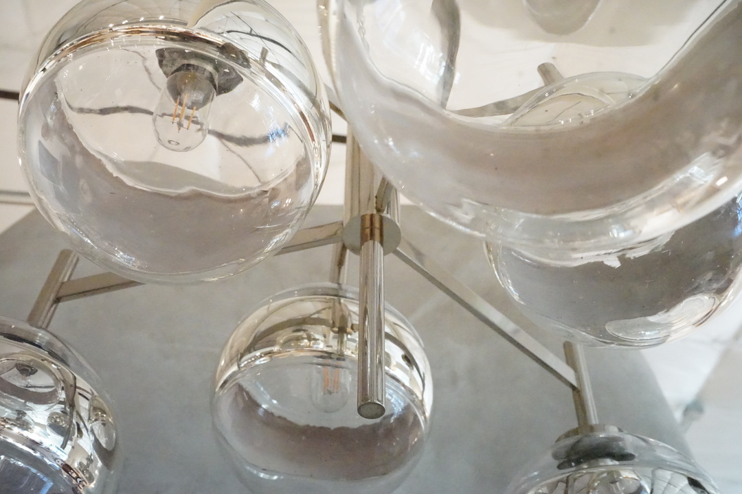 Six Light Italian Glass Chandelier with Striped Globes and Chrome Arms, Newly Rewired