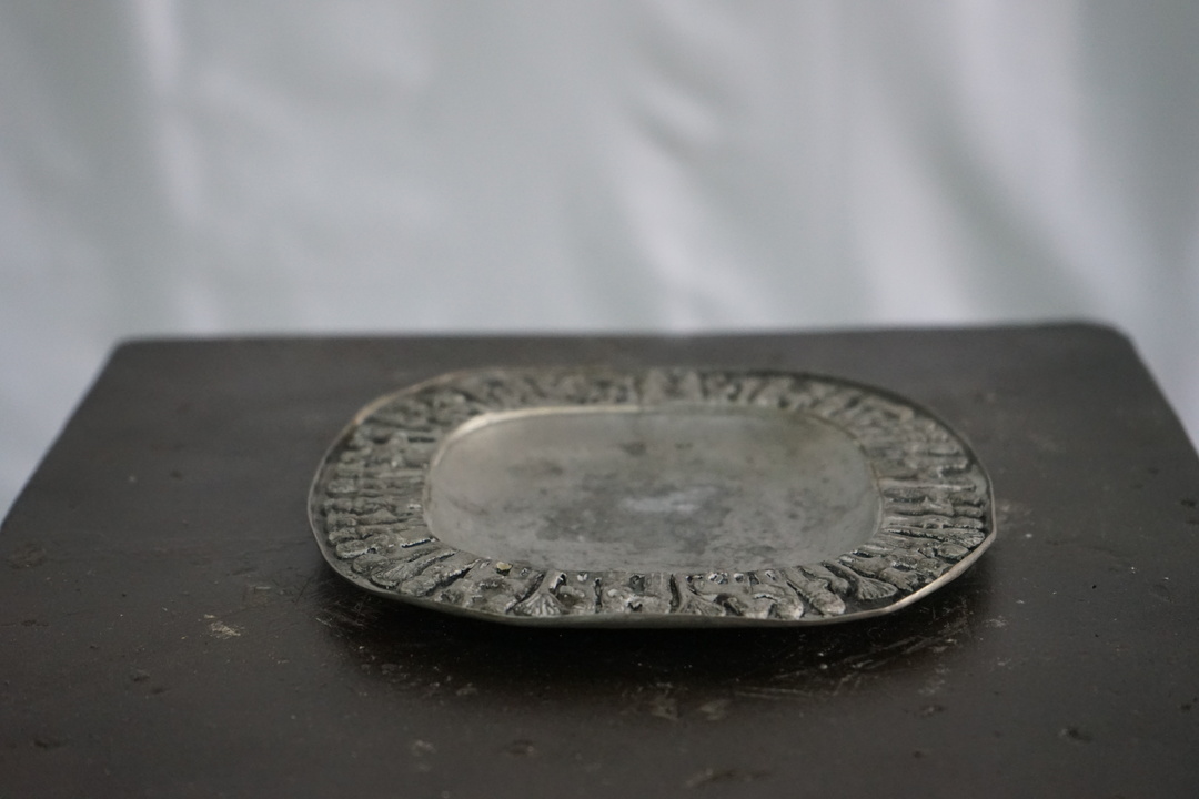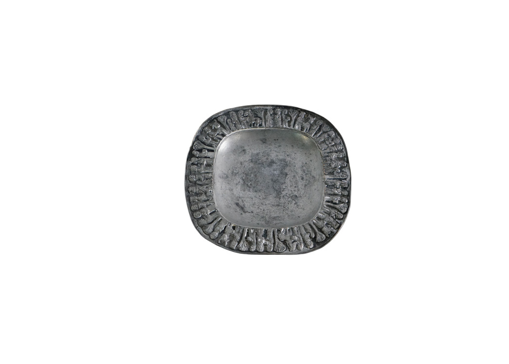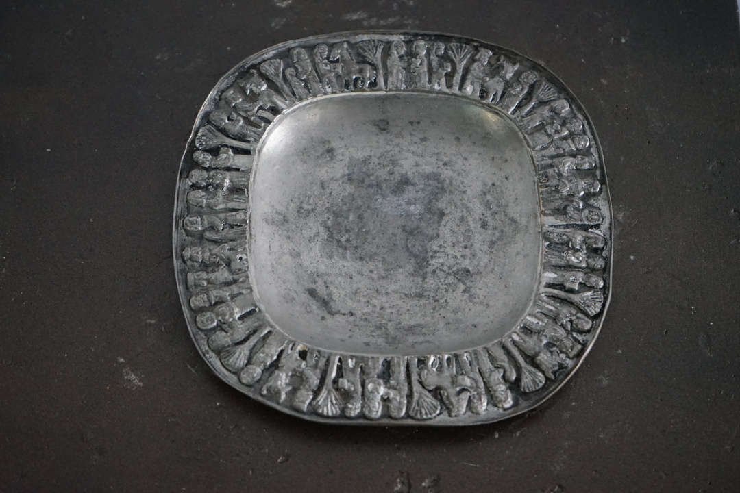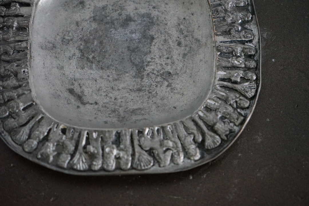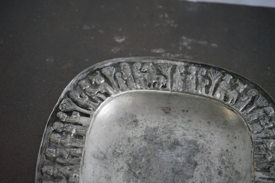 SMALL PEWTER TRAY WITH PEOPLE ON PERIMETER FROM BUDAPEST