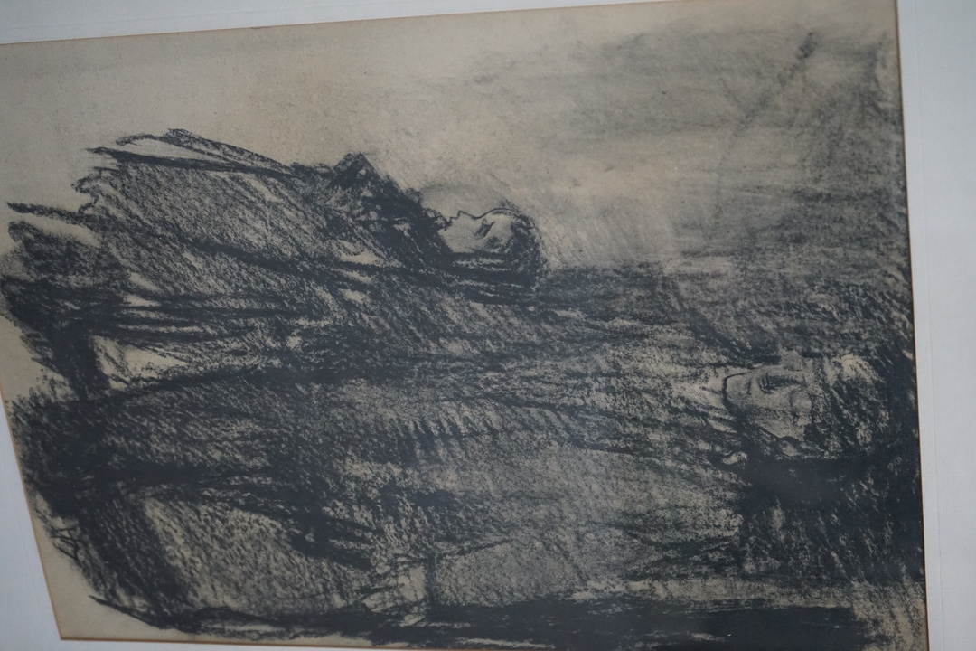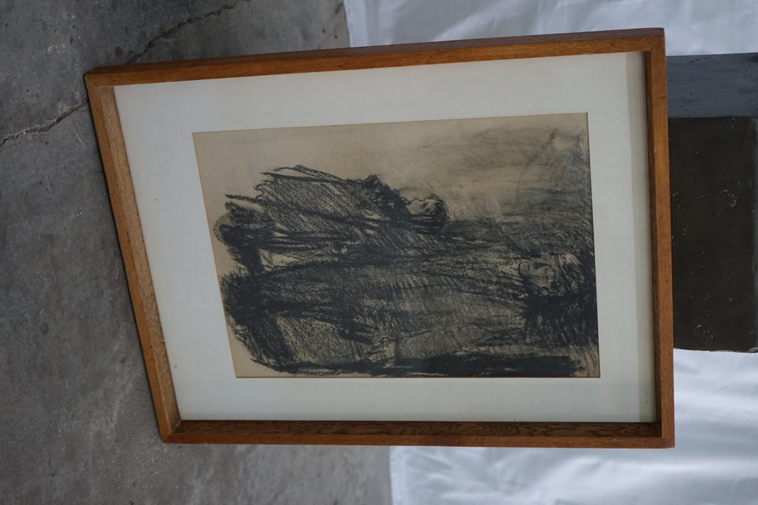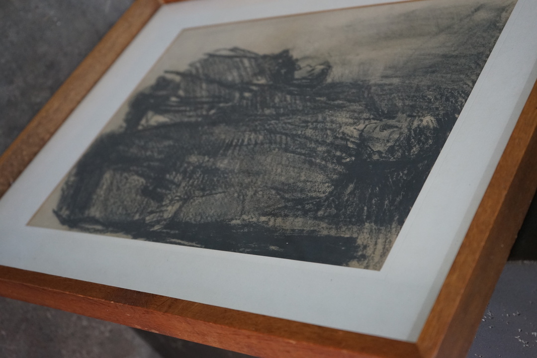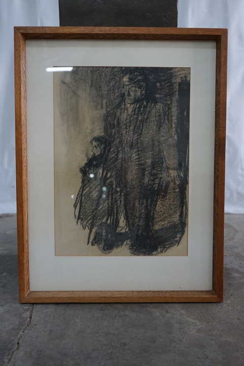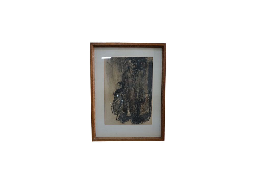 CHARCOAL OF FATHER AND DAUGHTER, FRAMED IN WOOD
