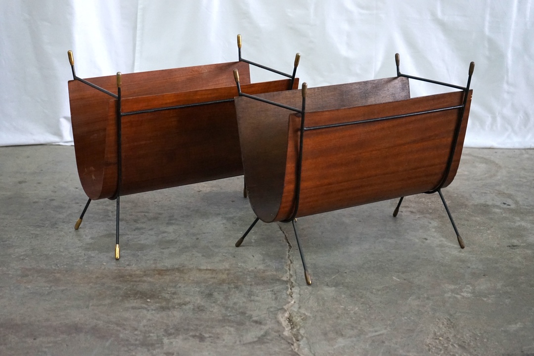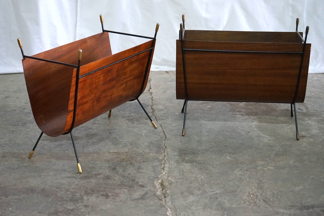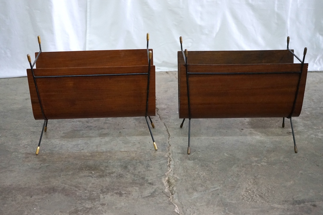 MID CENTURY BROWN VENEER AND METAL MAGAZINE RACK