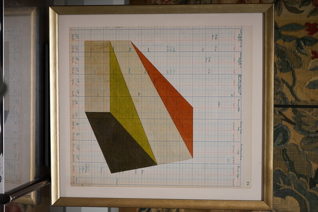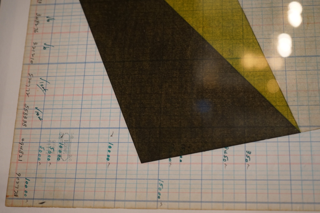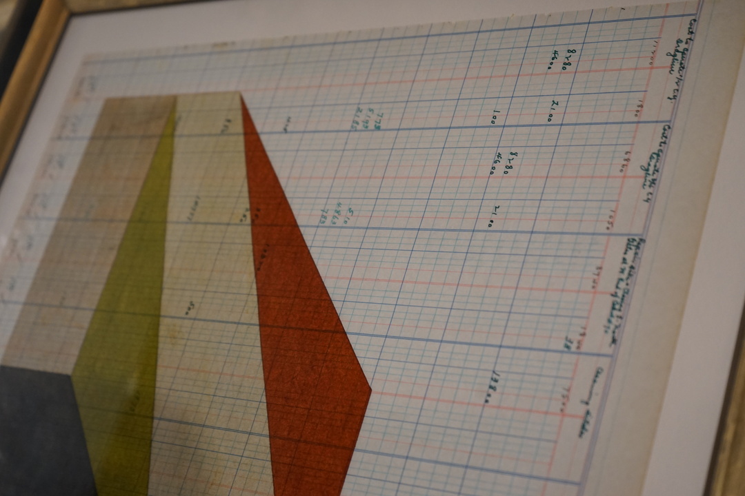 LARGE GEOMETRIC OIL PASTEL ON VINTAGE LEDGER PAPER IN THE STYLE OF SOL LEWITT