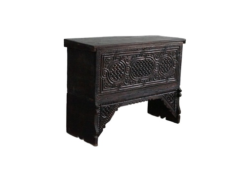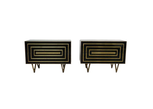 Lacquered Chest with Inlaid Brass Design and Faceted Brass Feet, Italian