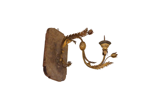 Very Rare 18th Century Italian Rococo Gilt and Hand Forged Iron Candle Sconces. Acanthus Leaf & Flower Motifs and Walnut Shield Back Plates